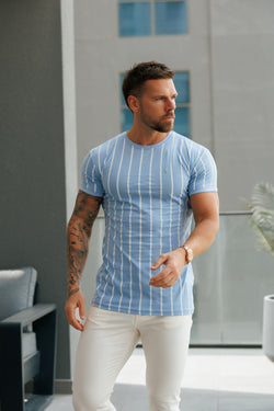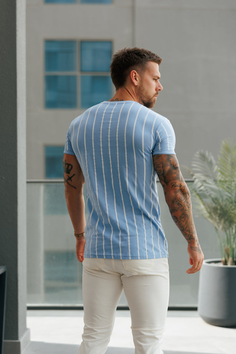 Printed Light Blue / White Stripe Fitted T Shirt - FSH1169